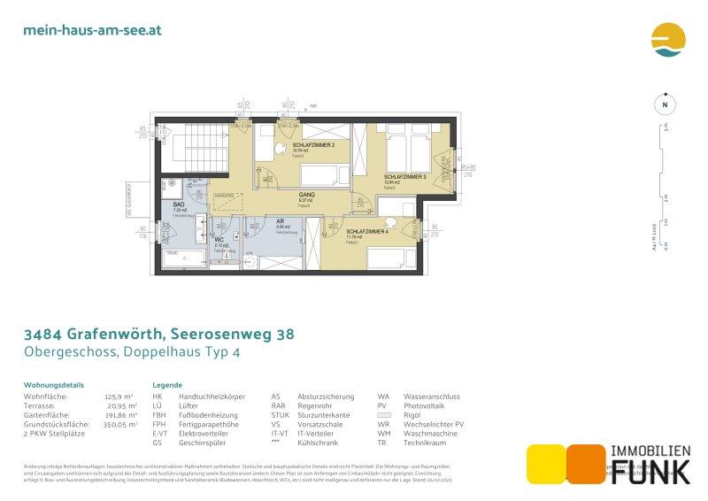 Vor dem Eingang zum Haus haben Sie zwei KFZ-Stellplätze, einen kleinen Vorplatz sowie die ca. 4,5 m² große Gartenhütte. Die gesamte Grundstücksfläche beträgt ca. 350,05 m². Sie betreten die Doppelhaushälfte Seerosenweg 38 über einen ca. 7,2 m² großen Vorraum, mit Platz für die Garderobe. Rechter Hand finden Sie den Technikraum und das Gäste-WC. Linker Hand befindet sich ein ca. 6,3 m² großer Abstellraum. Gerade aus gelangen Sie zu einem ca. 10,5 m² großen Schlafzimmer und zum ca. 36,16 m² großen Wohnküchenbereich, der sich zur ca. 21 m² großen Lärchenholzterrasse, dem Garten und zum See hin öffnet. Eine Treppe führt Sie in das Obergeschoss mit drei Schlafzimmern (ca. 10,7 m², 13 m² und etwa 11,7 m²), einem separaten WC, einem ca. 5,6 m² großen Abstellraum mit Waschmaschinenanschluss und dem ca. 7,2 m² große Badezimmer mit Doppelwaschtisch, Badewanne und Dusche.