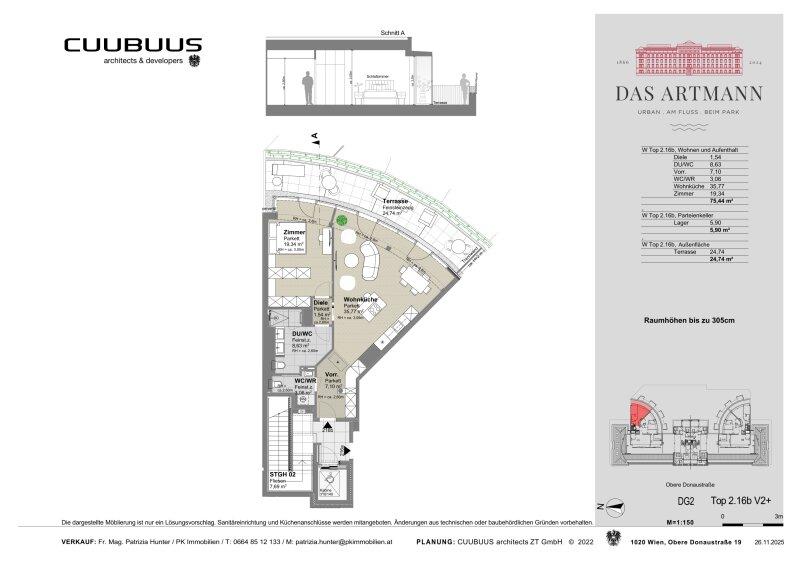 Die Wohnungsgrundrisse im Dachgeschoss eigenen sich für Singles ebenso wie für Familien. Nebst der hochwertigen Ausstattung genießen die zukünftigen Bewohner:innen in den meisten Fällen wunderbare Terrassen mit einem traumhaften Blick Richtung Donaukanal und Innenstadt.