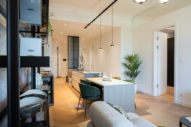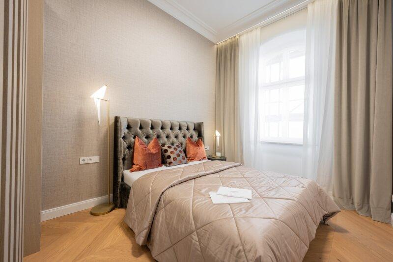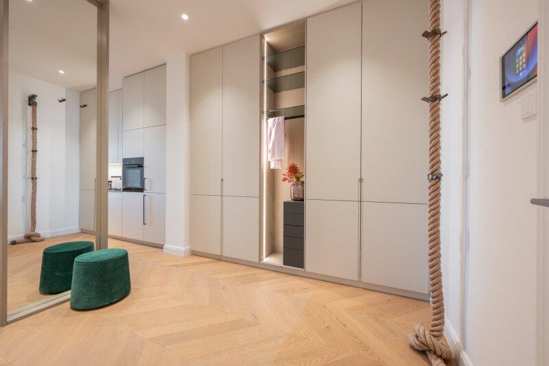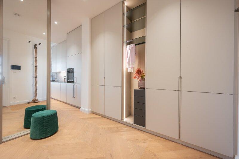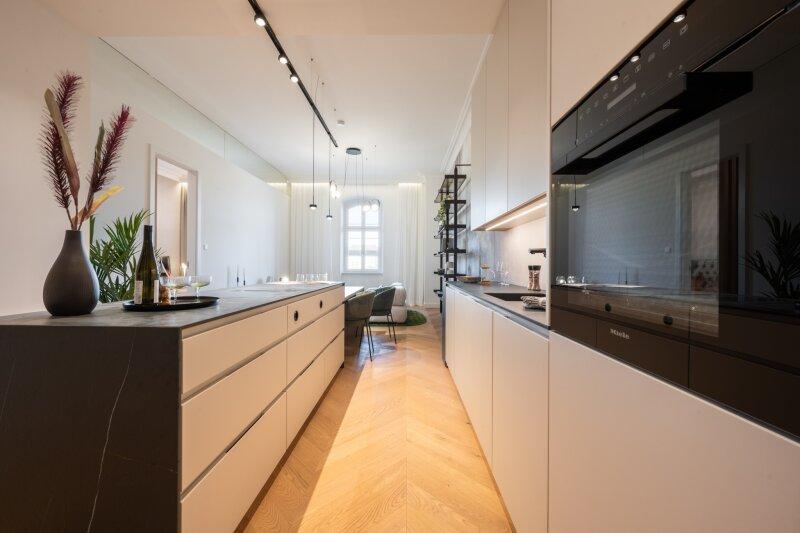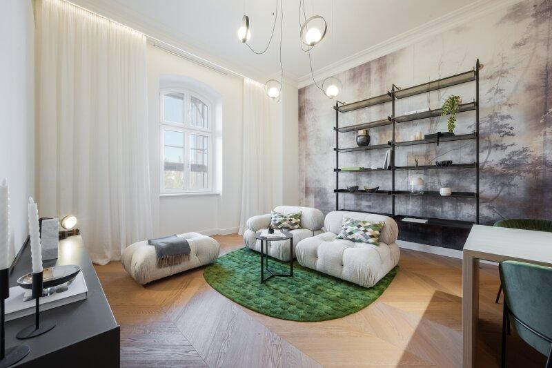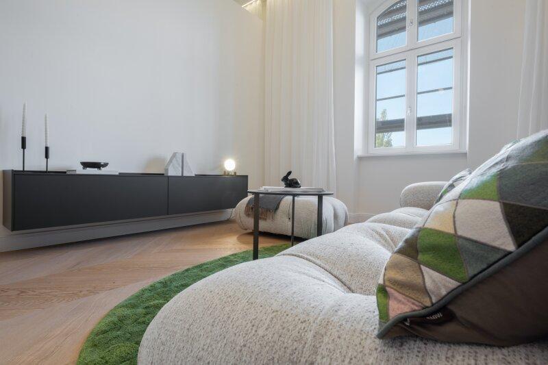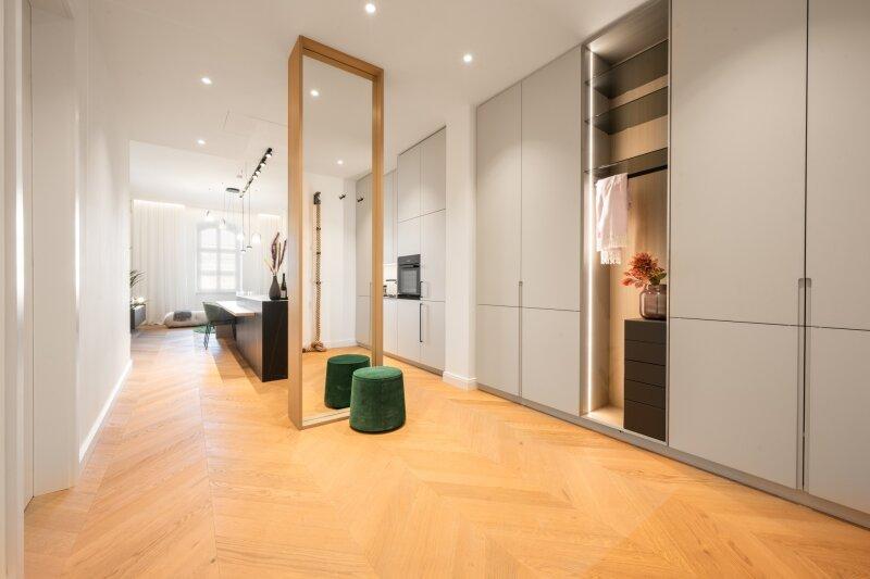 Die im Altbau gelegenen Einheiten beeindrucken durch luftige Raumhöhen, großformatiges Fischgrätparkett, elegante Sockelleisten und wunderbare Deckenstuckatur.