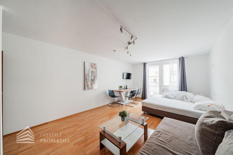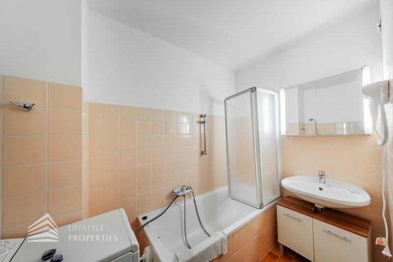 Sie betreten die Wohnung in ein einladendes Vorzimmer mit Garderobe, Schuhschrank und Einbauschrank, von wo aus Sie in den Hauptraum, das Badezimmer und WC sowie den Abstellraum gelangen. Das ca. 27 m² große Zimmer ist mit einer Küchenzeile ausgestattet und aktuell mit deinem Doppelbett, einem Esstisch sowie einer Couch und Couchtisch möbliert. Der Raum verfügt dank eines französischen Fensters über viel Tageslicht und ermöglicht aufgrund der Fläche und des Aufbaus die Trennung von Schlaf- und Wohnbereich. Das Badezimmer ist mit Badewanne, Waschtisch mit Unterschrank und Waschmaschine ausgestattet. Zudem bietet ein Abstellraum extra Stauraum.