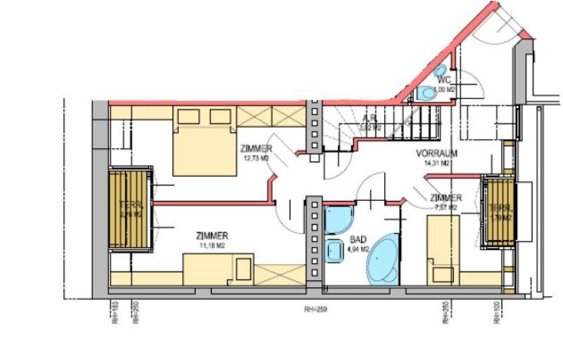 Die erste Ebene hat eine Größe von ca. 54,85 m² und ist auf ein Vorraum, drei Zimmer, ein Badezimmer, eine Toilette, und ein Abstellraum aufgeteilt. Die drei Zimmer haben eine Fläche von ca. 12,73 m², 11,18 m² und 7,57 m² und haben direkten Zugang zur erholsamen Terrasse. Das Badezimmer verfügt über eine natürliche Belichtung und ist mit einer Badewanne, einer Dusche und einem Waschbecken ausgestattet. Die Toilette mit Handwaschbecken befindet sich separat vom Badezimmer.