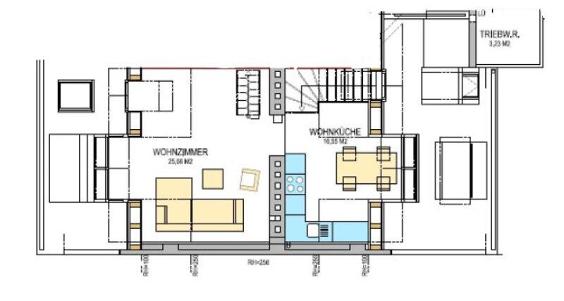 Die zweite Ebene erstreckt sich über 42,21 m². Hier befindet sich das weitläufige Wohnzimmer und eine separate Wohnküche. Durch den offen gestalteten Grundriss bietet die zweite Ebene genügend Raum für individuelle Gestaltungsmöglichkeit. Vom Wohnzimmer gelangt man auf das Highlight der Wohnung. Das ca. 14,74 m² große Flachdach ist modern gestaltet und bietet genügend Platz für gesellige Stunden oder als entspannter Rückzugsort und Wohlfühl-Oase.