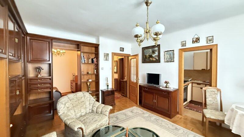 Die Wohnäume sind mit Parkett und die Nassräume mit Vinyboden verlegt. Fenster mit zweifachverglasung und Innenjalousien. Die Wohnung ist außerdem hell und geräumig durch die gelungene Raumaufteilung. Sie befindet sich im Ersten Liftstock.