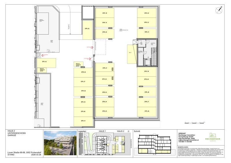 Es werden insgesamt 34 Garagenplätze, 8 überdachte Außenstellplätze sowie 2 Motorradstellplätze errichtet, die gesondert erworben werden können. Der Kaufpreis je Garagenplatz beträgt EUR 19.990, je überdachter Außenstellplatz EUR 14.990 und je Motorradstellplatz EUR 5.000.