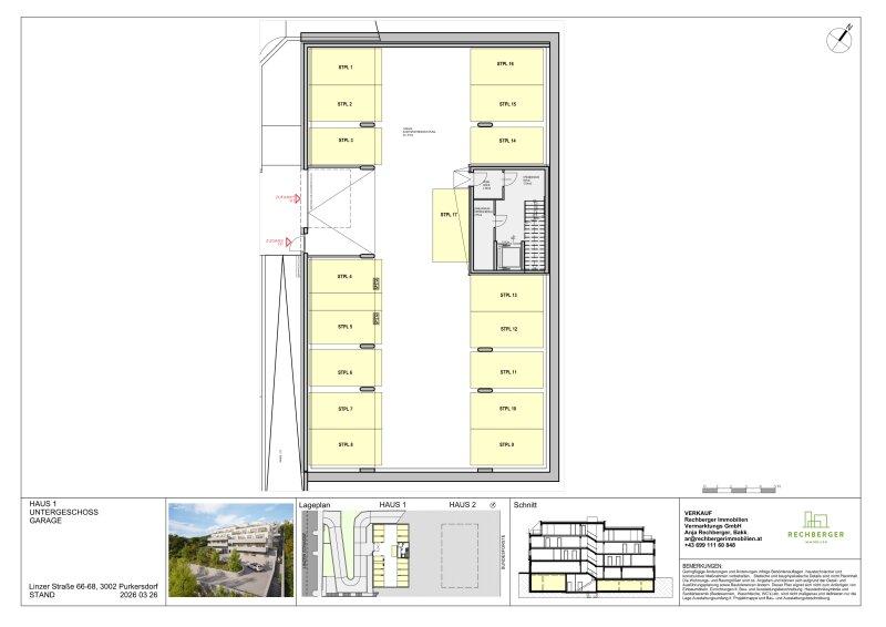Es werden insgesamt 34 Garagenplätze, 8 überdachte Außenstellplätze sowie 2 Motorradstellplätze errichtet, die gesondert erworben werden können. Der Kaufpreis je Garagenplatz beträgt EUR 19.990, je überdachter Außenstellplatz EUR 14.990 und je Motorradstellplatz EUR 5.000.