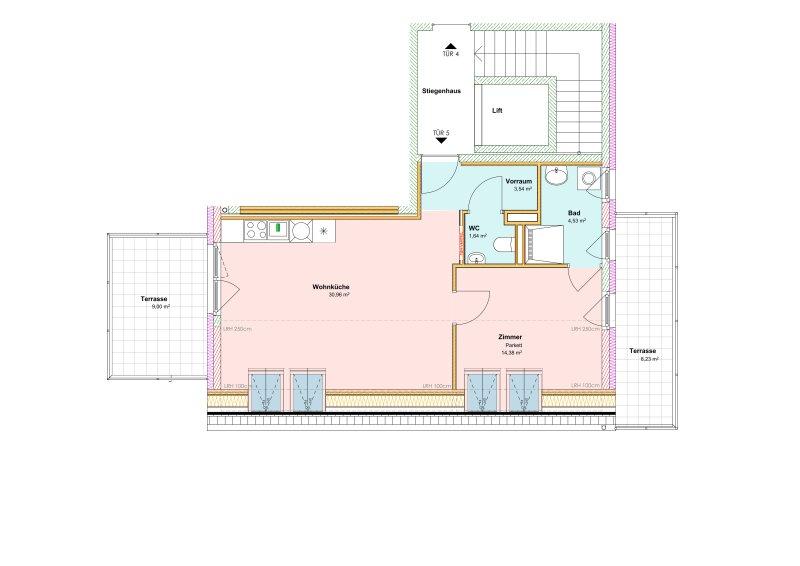 Der großzügige Wohnbereich mit offener Küche bildet das Herzstück der Wohnung und überzeugt durch viel Tageslicht sowie den direkten Zugang auf die westseitige, ca. 9 m² große Terrasse mit herrlichem Ausblick ins Grüne ideal für entspannte Abendstunden. Das gemütliche Schlafzimmer verfügt über einen direkten Zugang zur ostseitigen Terrasse (ca. 8 m²), die Morgensonne und Ruhe garantiert, sowie über den Zugang zum modern ausgestatteten Tageslicht-Badezimmer mit bodengleicher Walk-In-Dusche.