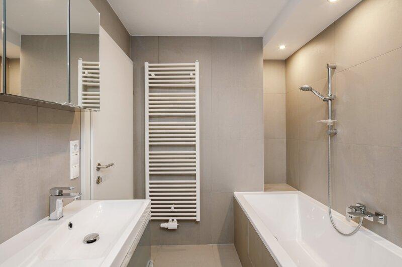 • top modernes Badezimmer mit Wanne, Dusche und Doppelwaschbecken sowie bereits eingebauten Kästen mit Aufbewahrungssystem