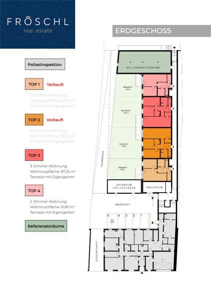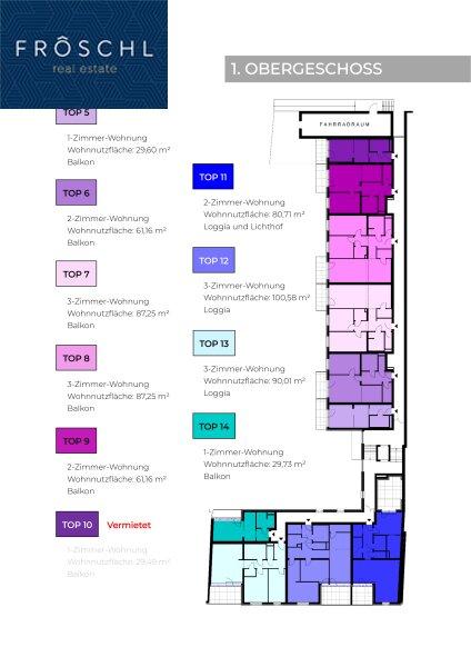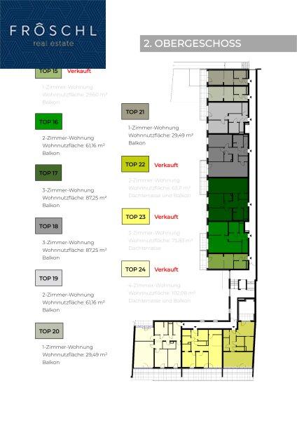 Die geplante Wohnhausanlage umfasst insgesamt 24 moderne Wohnungen sowie eine Büroeinheit, die auf drei Geschosse(Erdgeschoss, 1. Obergeschoss und 2. Obergeschoss) verteilt sind. Die Wohnungen Top 5 bis Top 14 im 1. Obergeschoss sind bereits bei Fertigstellung mit einer Einbauküche ausgestattet.