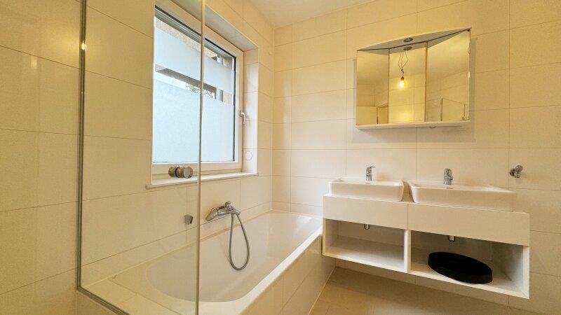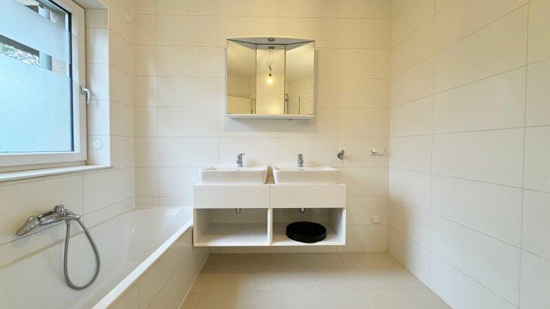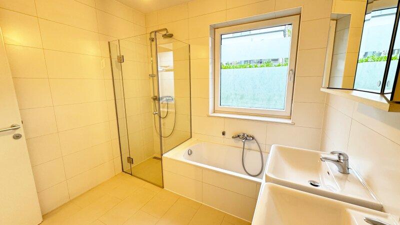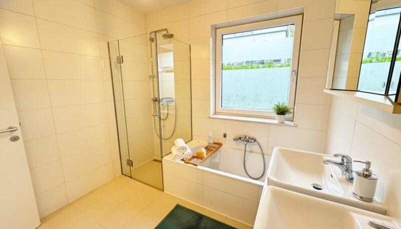 Das Badezimmer mit Fenster lässt viel Tageslicht herein und ist mit einer Kombination aus Badewanne, barrierefreier Dusche sowie einem großzügigen Doppelwaschtisch samt Ober- und Unterschränken ausgestattet. Eine separate Toilette sowie ein praktischer Abstellraum ergänzen den Grundriss und sind über den weitläufigen Vorraum zugänglich.