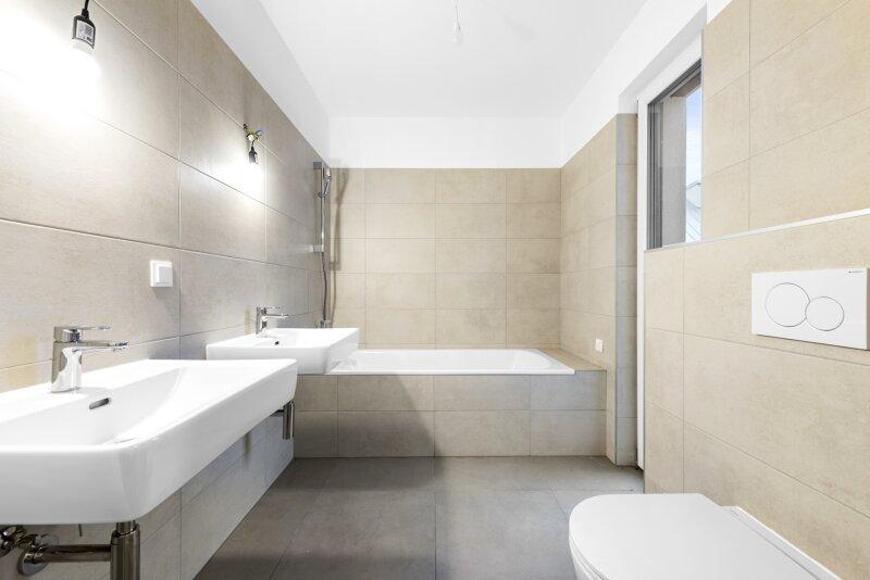 • Badezimmer mit WC, Badewanne und Doppelwaschtisch