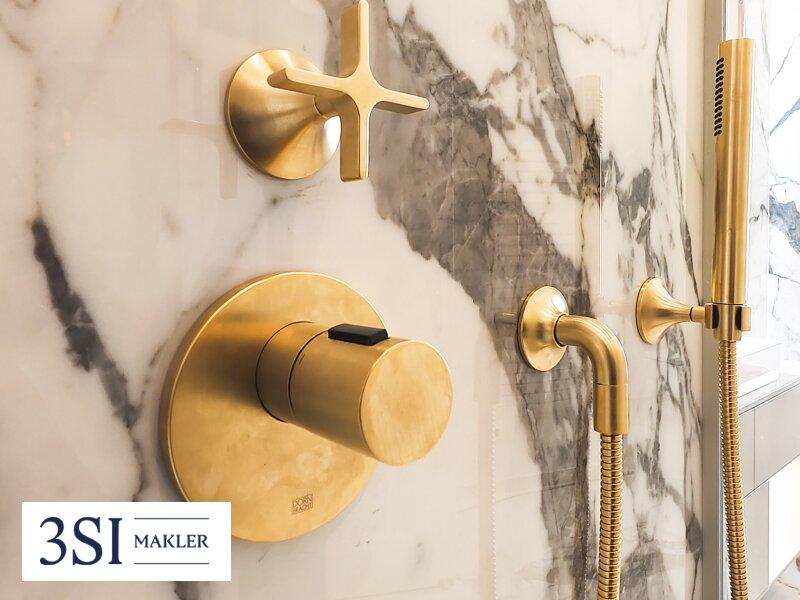 - Exklusive Bäder mit freistehender Badewanne, Doppelwaschtischen, Markenarmaturen und Marmoroptik-Feinsteinzeug