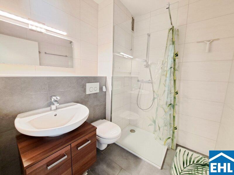 Über den Vorraum gelangt man in das Badezimmer, welches über eine Dusche, Toilette, Waschtisch samt Unterschrank sowie einen großflächigen Spiegel inkl. Beleuchtung verfügt. Das Zimmer von knapp 24 m² bietet genügend Platz, um sich einen gemütlichen Wohn-Essbereich sowie eine kleine Schlafnische einzurichten. Die Küchenzeile beinhaltet eine kleine Herdplatte, Backrohr sowie einen Geschirrspüler. Ein Kühlschrank wäre noch zu ergänzen.