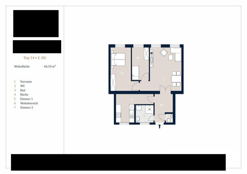 Sie betreten die Wohnung und befinden sich im Vorraum. Links befindet sich die Küche. Gerade durch gelangen Sie in das Wohnzimmer, von hier gelangen Sie auch in die 2 getrennt begehbaren Zimmer. Das Bad ist mir einer Dusche, einem Waschbecken und einem Waschmaschinenanschluss ausgestattet. Das separate WC befindet sich im Vorraum.