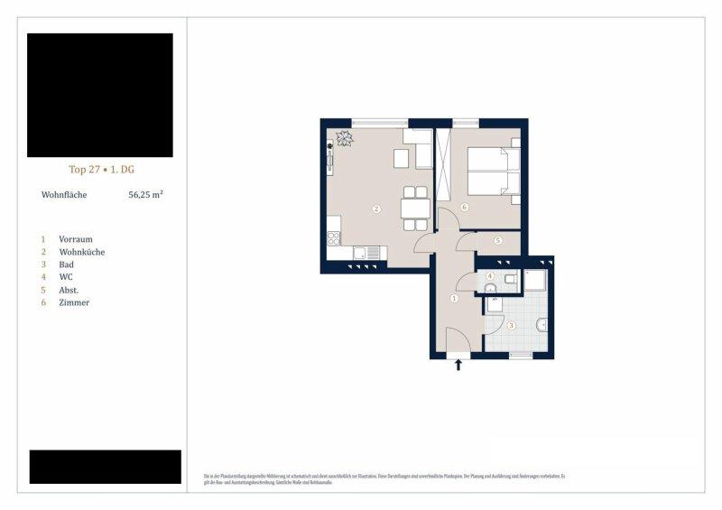 Sie betreten die Wohnung und befinden sich im Vorraum, links gelangen Sie in die helle Wohnküche. Das Schlafzimmer befindet sich gleich daneben. Das Badezimmer ist mit einer Dusche, einem Waschbecken und einem Waschmaschinenanschluss ausgestattet. Das separate WC und der Abstellraum befinden sich auch im Vorraum. Die Wohnräume sind mit schönem Parkettboden ausgestattet und die Nassräume sind verfliest. Beheizt wird mit Fussbodenheizung.