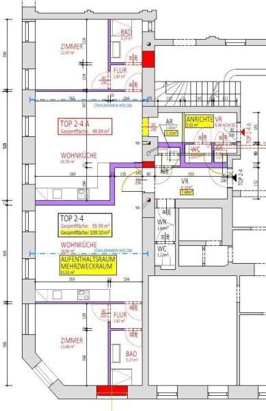 Hierbei handelt es sich um eine großzügige ca. 106m² große unrenovierte Altbaufläche, welche 2 in Wohnungen umgebaut werden kann. Hierzu gibt es bereits eine Entwurfsplanung (siehe Anhang). Die ursprüngliche Bürofläche wurde zwischenzeitlich bereits zu Wohnzwecken umgewidmet. Die leicht über dem Erdgeschoß gelegen Fläche verfügt über hohe Räume sowie große Fensterflächen und garantieren eine gute Belichtung.Die leicht über dem Erdgeschoß gelegen Fläche verfügt über hohe Räume sowie große Fensterflächen und garantieren eine gute Belichtung.