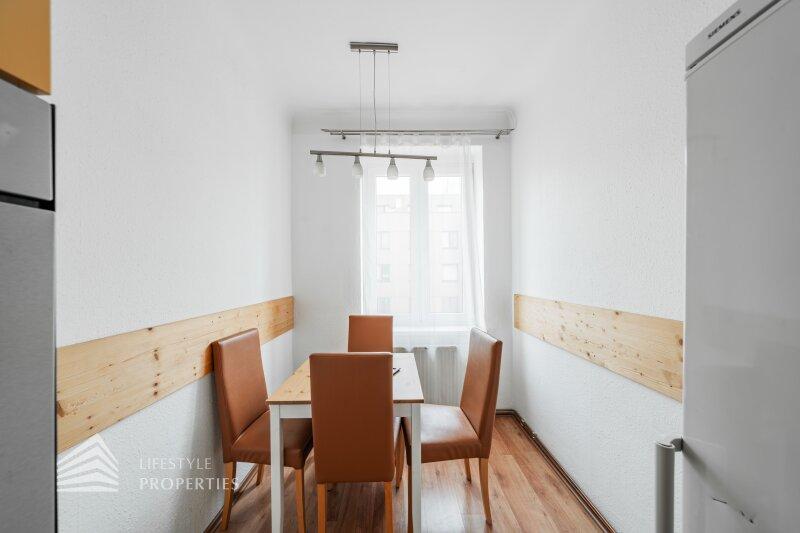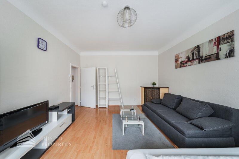 Die Wohnung liegt im 4. Stock eines gepflegten Altbaus und ist bequem mit dem Lift zu erreichen. Auf insgesamt ca. 58 m² Wohnfläche verfügt die Immobilie über ein großes Zimmer, ein Kabinett, eine getrennte Küche, einen Abstellraum, ein Badezimmer sowie ein separates WC. Die Wohnung ist mit Laminatböden in den Haupträumen sowie Fliesen in Badezimmer und WC ausgestattet und wird inklusive aller auf den Fotos ersichtlichen Möbel verkauft.
