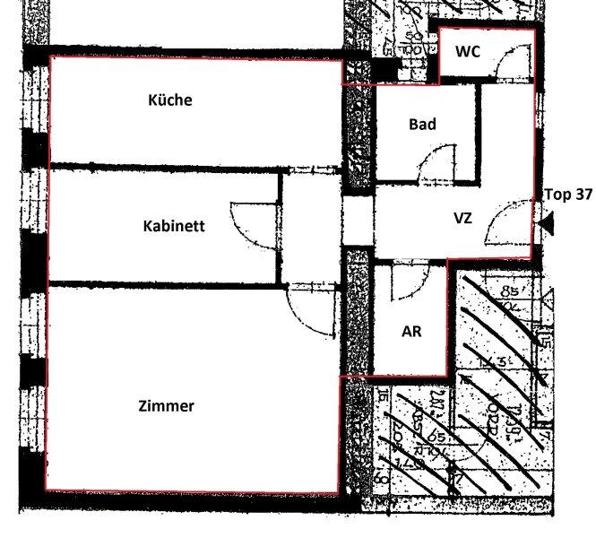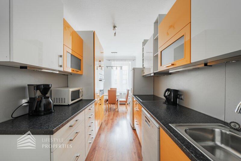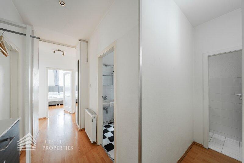 Sie betreten die Wohnung in ein geräumiges Vorzimmer, von wo aus alle Räume zentral begehbar sind. Geradeaus gelangen Sie in das ca. 9 m² große Kabinett, welches aufgrund seiner Fläche zwar nicht als vollwertiges Zimmer betrachtet wird, sich allerdings ideal als Schlafzimmer, Büro oder Gästezimmer eignet. Zu Ihrer Rec hten befindet sich die Küche, welche auf großzügigen ca. 17 m² über einen Essbereich und eine voll ausgestattete Küche verfügt. Das ca. 27 m² große Zimmer bietet viel Platz und ist aktuell mit einem Doppelbett, einem Schreibtisch, einer Couch sowie TV-Möbeln ausgestattet. Dank zwei großer Fenster verfügt dieser Raum über besonders viel Tageslicht. Ein mit Badewanne und Waschtisch ausgestattetes Bad, eine separate Toilette sowie einen Abstellraum befinden sich im Eingangsbereich.