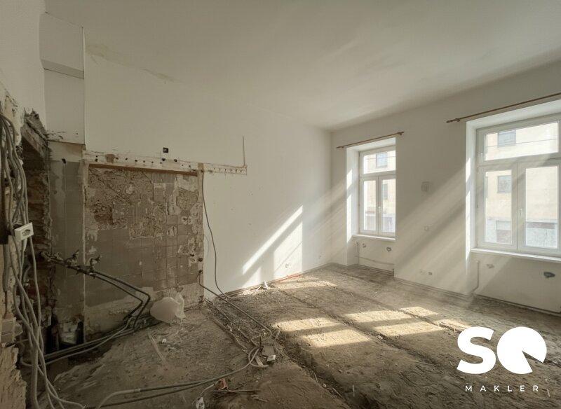 Die Wohnung wird derzeit umfassend modernisiert und präsentiert sich ab 1. Jänner 2026 im Erstbezug - Eine perfekte Kombination aus historischem Altbauflair, zeitgemäßem Wohnkomfort und stylishen Farbkonzepten mit Wandleuchten, Stuckatur und hochwertigen Materialien. Das großzügige Wohnzimmer bildet das Herzstück der Wohnung. Besonderes Augenmerk gilt auch dem Schlafbereich: Dieser verfügt über ein exklusives Bad en Suite, das direkt vom Schlafzimmer aus zugänglich ist, sowie einen französischen Balkon mit Weitblick in den ruhigen Innenhof. TV-Kabel sind im Wohn- und Schlafzimmer vorbereitet.