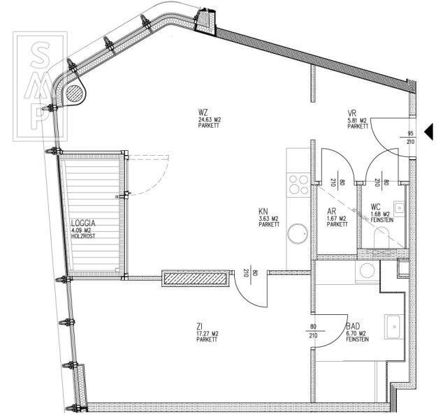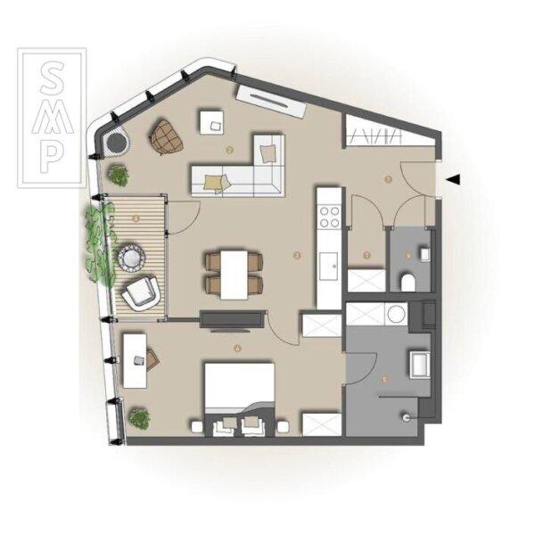 Die Wohnung wurde modern ausgestattet und die Möbel sind Teil des Mietgegenstands. Des Weiteren verfügt die Wohnung über eine großzügige Loggia, ein großes Bad mit begehbarer Dusche und Waschmaschinenanschluss sowie einen Wirtschaftsraum und ein Kellerabteil.