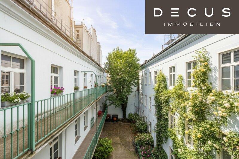 Der begrünte Innenhof ist ein städtisches Kleinod, das mitten in Wien eine Oase der Stille schafft. Ein charmanter, kleiner Rückzugsort mit üppiger Bepflanzung aus Feigenbaum, Rosen, Hortensien, Klematis, Lavendel, Pfingstrosen, Schneerosen, Efeu & mehr.