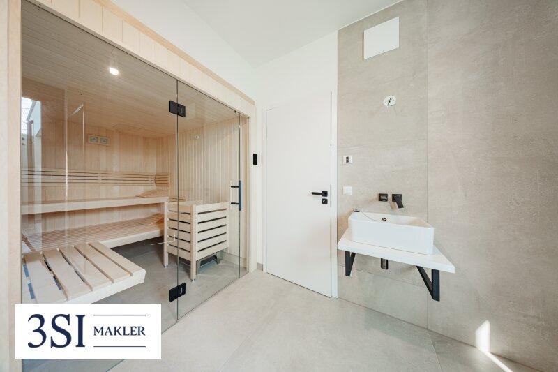 - Untergeschoß: Schlafzimmer, Bad mit Dusche, Wanne und WC, Sauna, Ruhebereich mit Dusche, Technikraum, WC, Zugang zum Pool und 192 m² Garten