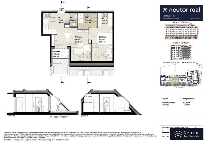 Beim Betreten empfängt Sie ein freundlicher Vorraum, der ausreichend Platz für Garderobe bietet und gleich zu Beginn mit einem separaten WC samt Handwaschbecken für zusätzlichen Alltagskomfort punktet.Vom Vorraum aus gelangen Sie direkt in die Kochnische sowie in den hellen, offen gestalteten Wohnbereich, der als zentraler Treffpunkt der Wohnung zum Entspannen, Kochen und Verweilen einlädt.Von hier aus haben Sie direkten Zugang zur Dachterrasse, die einen geschützten Außenbereich für entspannte Stunden im Freien bietet ideal für sonnige Nachmittage oder laue Abende.Ein besonderes Highlight ist das großzügige Schlafzimmer, das direkt an den Wohnbereich angrenzt. Es verfügt über einen integrierten Schrankraum und ein elegantes En-Suite-Badezimmer mit komfortabler Dusche, Tischlerverbau und elegant eingebautem Waschmaschinenanschluss durchdachter Wohnkomfort auf höchstem Niveau.Diese Dachgeschosswohnung überzeugt durch ihre moderne Raumaufteilung, hochwertige Ausstattung und eine helle, stilvolle Wohnatmosphäre ideal für Singles oder Paare, die ein besonderes Zuhause mit Qualität und Charakter suchen.