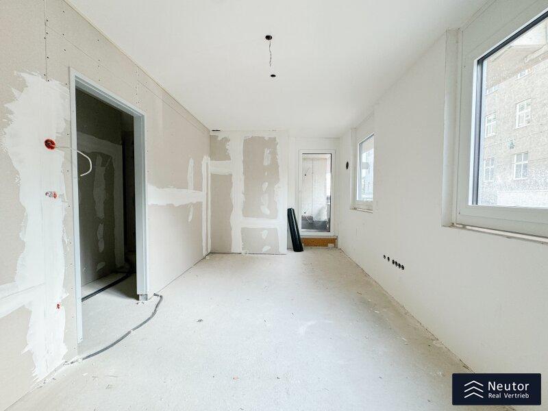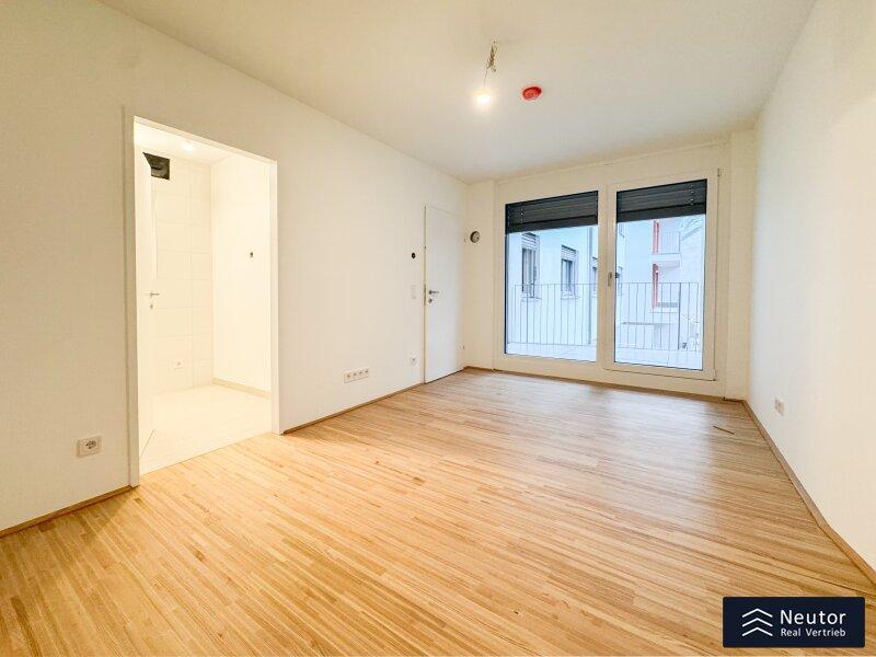 Diese stilvolle Wohnung überzeugt durch eine durchdachte Raumaufteilung, hochwertige Materialien und ein modernes Wohnambiente. Beim Betreten empfängt Sie ein einladender Vorraum, der ausreichend Platz für Garderobe und Stauraum bietet. Rechtsbefindet sich ein separates WC mit Handwaschbecken praktisch für Gäste und den Alltag. Geradeaus öffnet sich der lichtdurchflutete Wohnbereich, der Küche, Essplatz und Wohnzimmer harmonisch vereint. Hier entsteht ein offener, freundlicher Raum, der sowohl zum Entspannen als auch zum geselligen Beisammensein einlädt. Vom Wohnzimmer aus gelangen Sie direkt auf die überdachte Loggia ein geschützter Freiraum, der zum Verweilen im Freien einlädt, ganz gleich bei welchem Wetter. Das Schlafzimmer, das ebenfalls direkt vom Wohnzimmer aus begehbar ist, bietet nicht nur angenehme Ruhe, sondern verfügt auch über ein eigenes, modernes En-Suite-Badezimmer mit Dusche ideal für zusätzlichen Komfort und Privatsphäre. Mit ihrer klaren Raumaufteilung, den hochwertigen Ausstattungsdetails und der hellen Wohnatmosphäre ist diese Wohnung ein Zuhause, das durch Stil und Funktionalität gleichermaßen überzeugt. Ein Wohntraum für Singles, Paare oder alle, die modernes Wohnen mit cleverem Grundriss schätzen!