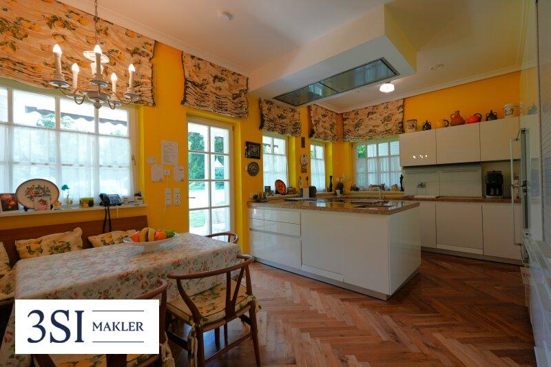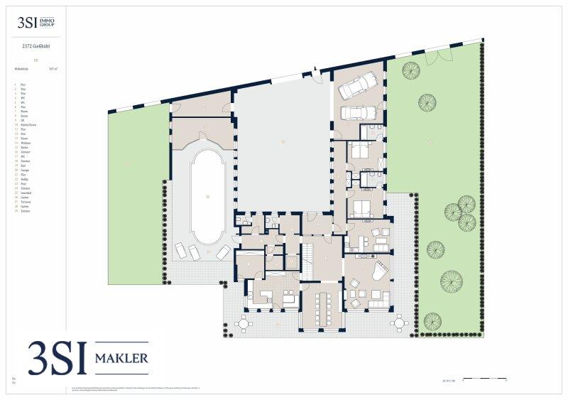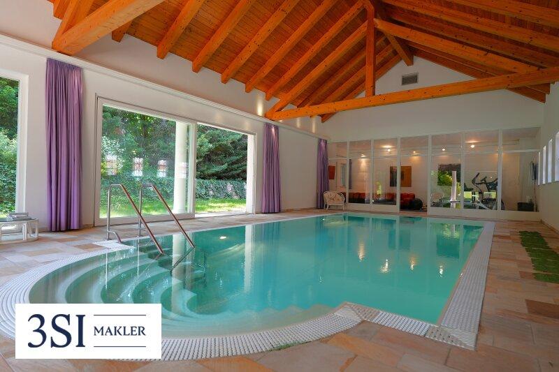 Auf der rechten Seite erwartet Sie die Küche mit Zugang zur Terrasse mit Natursteinplatten und elektrischer Markise, perfekt für entspannte Stunden im Freien. Dahinter befinden sich der Aufzug und die diskret platzierte Waschküche. Der rechte Seitenflügel bietet zudem ein Gäste-WC, eine Sauna, einen Personalbereich sowie eine elegante Schwimmhalle mit Fitnesszone. Raumhohe Schiebetüren und ein offenes Dach schaffen ein lichtdurchflutetes Wellnessambiente mit Blick ins Grüne. Ein besonderer Vorteil der Villa ist der großzügige Stauraum mit maßgefertigten Einbauschränken in Tischler-Handarbeit.