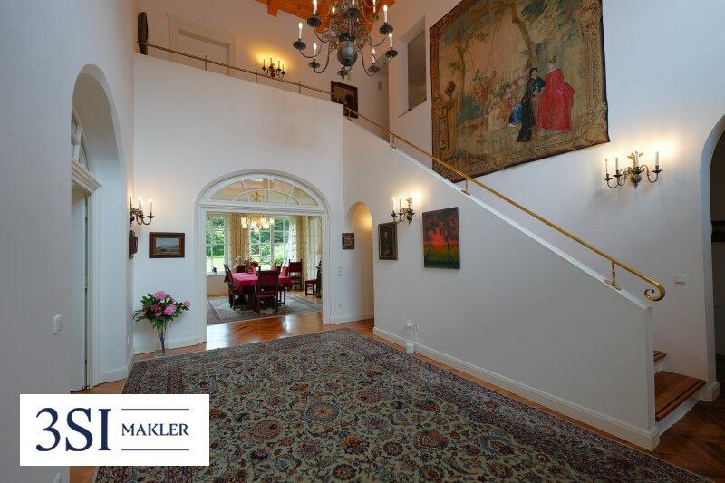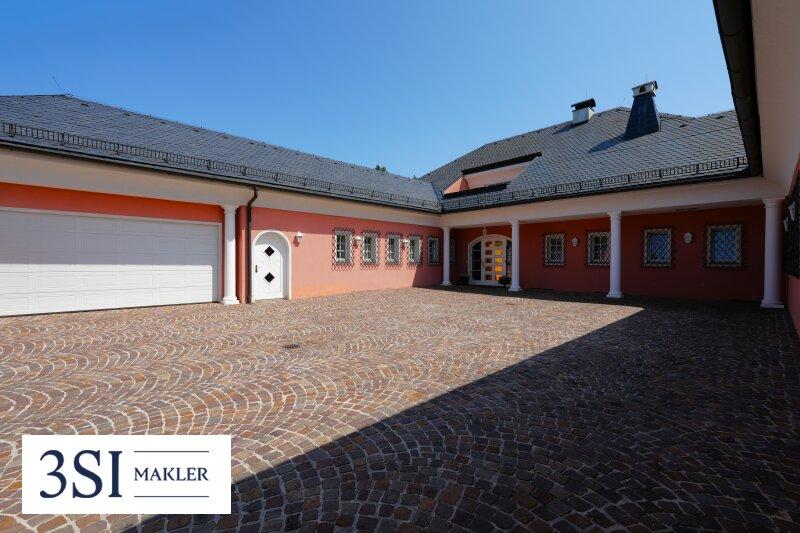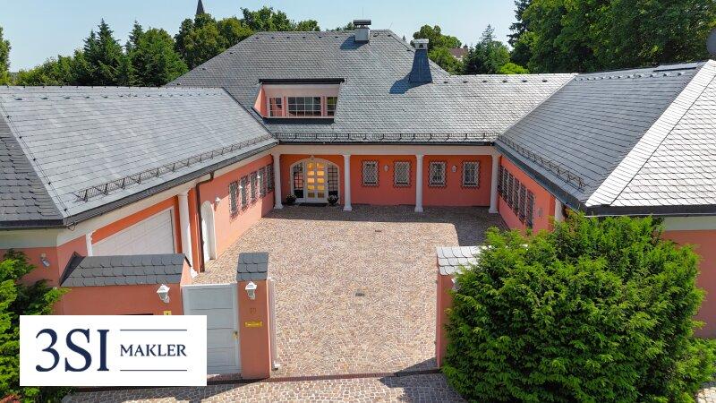 Schon der erste Eindruck lässt erkennen: Dieses Haus ist etwas Besonderes. Das großzügige, elektrisch betriebene Einfahrtstor öffnet sich zu einem gepflegten Vorplatz mit eleganter Pflasterung. Die massive Segmentbogentür führt in ein stilvolles Entrée mit Natursteinboden und öffnet sich zum imposanten Atrium, ein architektonisches Highlight mit beeindruckender Raumhöhe. Das Esszimmer mit Stuckdecke und direktem Zugang zur Südterrasse und Garten lädt zu heimeligen Abenden ein. Der angrenzende Wohnbereich überzeugt mit Großzügigkeit, Kamin und liebevollen Details, ein Ort zum Wohlfühlen. Im linken Flügel befindet sich der Gäste-Trakt mit zwei Zimmern, jeweils mit eigenem Bad und Zugang zum toskanisch gestalteten Garten. Ein zusätzliches Gäste-Wohnzimmer sorgt für Komfort und Privatsphäre.