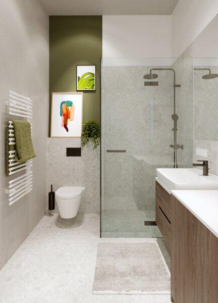 Darüber hinaus verfügt die Wohnung über ein gemütliches Schlafzimmer mit angrenzendem, modern gestaltetem Badezimmer. Ein praktischer Abstellraum sorgt für zusätzlichen Stauraum. Das stilvolle Badezimmer besticht durch hochwertige Ausstattung mit einer Badewanne und ein elegantes Design.