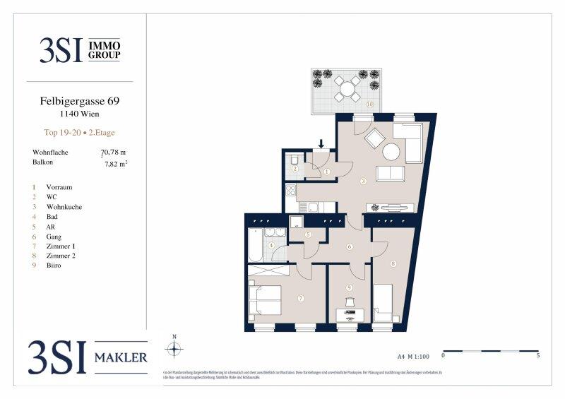 Die durchdachte Raumaufteilung umfasst einen Vorraum, eine großzügige Wohnküche, zwei Zimmer, ein zusätzliches Büro, ein modernes Badezimmer, ein separates WC, einen Abstellraum sowie einen zentralen Gang. Damit eignet sich die Wohnung ideal für Familien, Paare mit Homeoffice-Bedarf oder anspruchsvolle Eigennutzer.