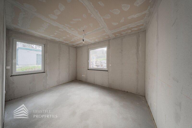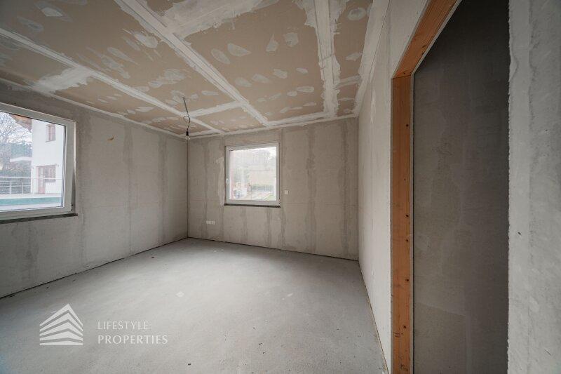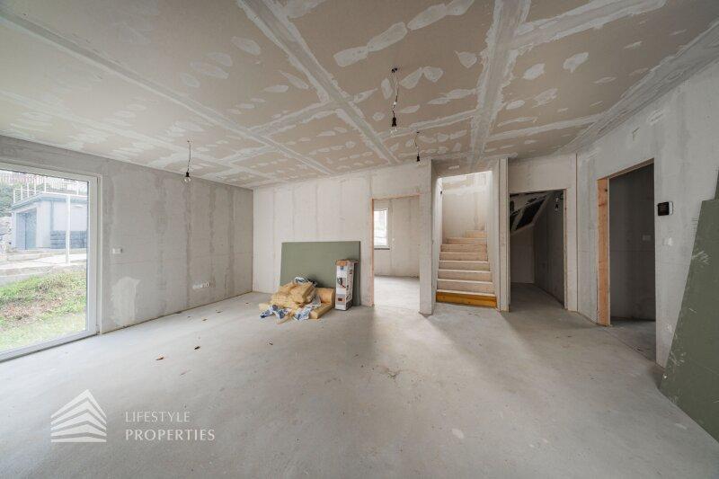 Beim Betreten des Hauses gelangen Sie in einen einladenden Vorraum. Rechts befindet sich ein Technikraum und ein Gäste-WC. Geradeaus öffnet sich ein lichtdurchflutetes Wohn-Esszimmer, wo eine traumhafte Küche Platz finden kann, mit direktem Zugang zur Terrasse und zu dem traumhaften Garten. Rechts liegt zudem ein Gästezimmer, das auch als Büro genutzt werden kann. Auf der rechten Seite führt eine Treppe ins Obergeschoss.