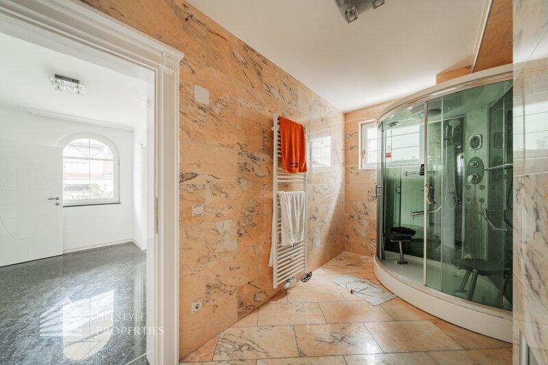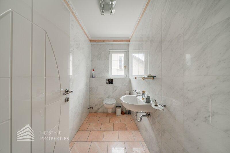 Beim Betreten der Villa gelangen Sie in das Erdgeschoß und einen einladenden Vorraum, welcher Sie in die Räumlichkeiten dieser Etage führt. Zunächst befindet sich rechterhand ein helles ca. 19 m² großes Arbeitszimmer, welches aber auch wunderbar als Gästezimmer genutzt werden kann. Direkt gegenüber befindet sich ein kleiner Vorraum, der Sie zu dem ersten Badezimmer, einem separatem WC und einem Abstellraum führt. Gegenüber der Eingangstüre gelangen Sie in den geräumigen und großzügigen Wohnessbereich, welcher mit einer Größe von knapp 56 m2 besticht. Hier befindet sich außerdem die ca. 23 m2 große offene Küche. Der Wohnbereich bietet ausreichend Platz für einen einladenden Esstisch und ein großes gemütliches Sofa. Von hier aus gelangen Sie auf die knapp 46 m2 große Terrasse, welche Sie auch in den eigenen und ruhigen Garten führt.