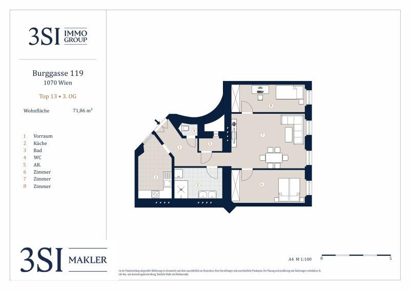 Die Wohnung befindet sich im 3. Stock in der Burggasse 119 im 7. Wiener Gemeindebezirk, einem lebendigen und beliebten Viertel. Die Umgebung zeichnet sich durch eine hohe Fußgängerfrequenz, zahlreiche Geschäfte, Cafés und Restaurants aus, was für eine hohe Sichtbarkeit sorgt. Nur wenige Gehminuten entfernt befinden sich die U-Bahn-Stationen U3 Zieglergasse und U6 Gumpendorfer Straße, die eine ausgezeichnete Anbindung an den öffentlichen Verkehr bieten.