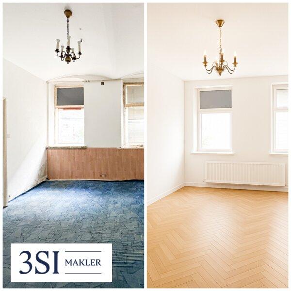 Das Titelbild vermittelt einen Eindruck vom aktuellen Zustand der Wohnung und zeigt zugleich, wie sie nach einer umfassenden Sanierung aussehen könnte.