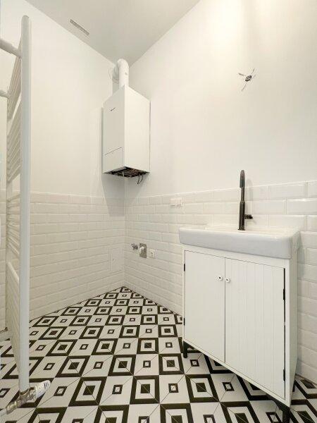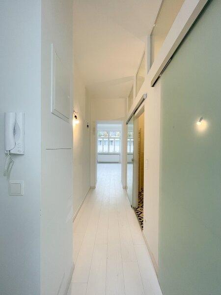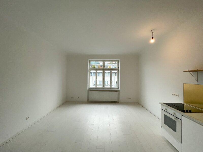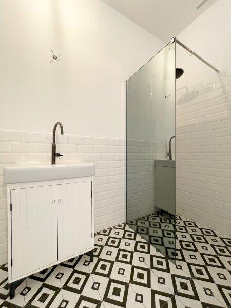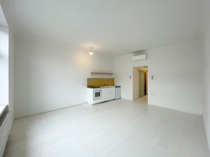 Das helle klimatisierte Zimmer mit Küchenzeile bietet ausreichend Platz zum Wohnen, Schlafen und Genießen. Ein echtes Highlight sind das großzügige Badezimmer mit bodenebener verfliester Dusche sowie das separate WC mit Handwaschbecken und Fenster zum Innenhof beide Räume wurden kürzlich modernisiert und präsentieren sich im stilvollen Schwarz-Weiß-Look im Industrial Style. Platzsparende Schiebetüren sorgen für zusätzliche Wohnqualität.