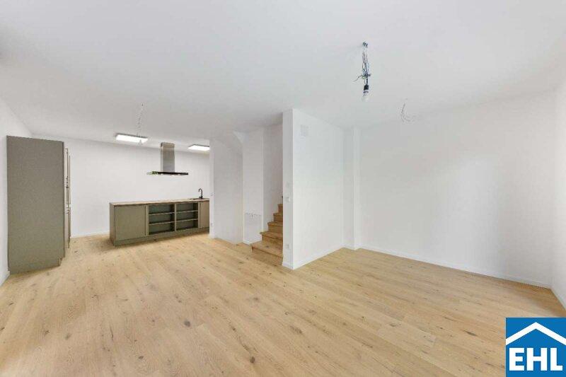 Über eine Treppe erreicht man das fast 40m² große Wohnzimmer. Die großzügige, offen gestaltete Wohnküche mit eleganter Kücheninsel bildet das Herzstück des Hauses ein Ort für gesellige Kochabende, gemeinsames Essen mit Familie und Freunden sowie entspannte Genussmomente. Direkt angrenzend befinden sich die Terrasse und der Poolbereich, die den Wohnraum nahtlos ins Freie erweitern und ein wunderbares Wohngefühl schaffen.