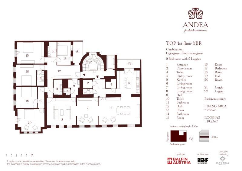 Betreten Sie diese außergewöhnlich großzügige Fünf-Schlafzimmer-Wohnung mit zwei Loggien, die sich über rund 298 m² Wohnfläche erstreckt und mit einer beeindruckenden Raumhöhe von ca. 3,50 Metern ein besonders repräsentatives Wohngefühl vermittelt. Diese exklusive Wohnung im 1. Obergeschoss des Projekts ANDEA Parkside Residences verbindet klassische Wiener Architektur mit modernem Wohnkomfort und hochwertiger Ausstattung ein Zuhause für anspruchsvolle Bewohnerinnen und Bewohner, die Großzügigkeit, Eleganz und urbane Lebensqualität schätzen.