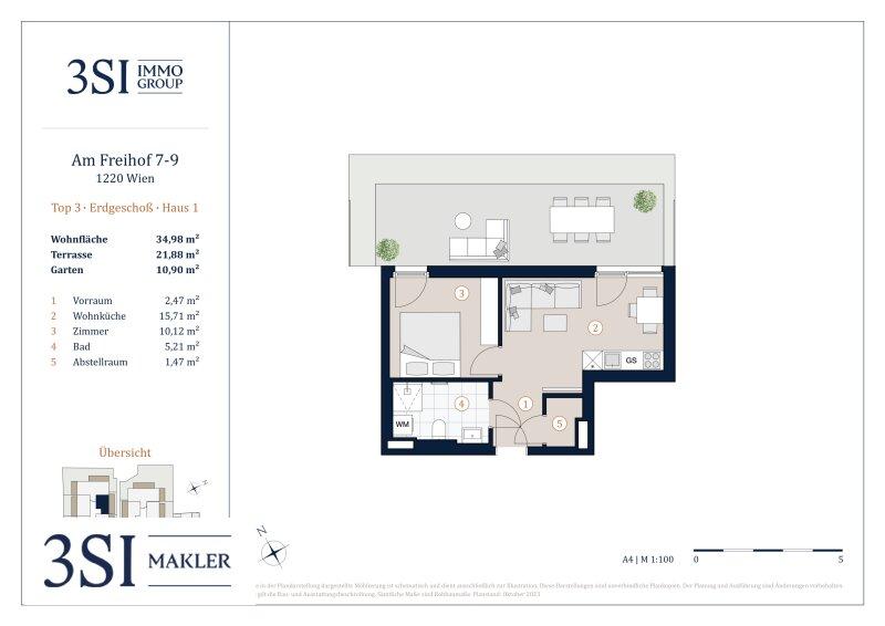 Die Wohnung verfügt über rund 35 m² + 22m² Terrasse und 11m² Garten und teilt sich wie folgt auf: