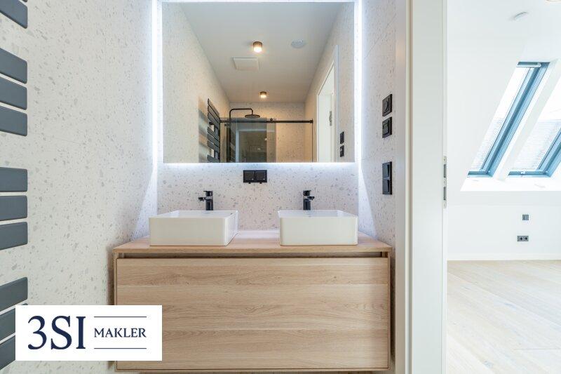 Das hochwertig ausgestattete Badezimmer begeistert mit einer Walk-In-Dusche, einem Doppelwaschtisch und modernen Materialien. Die Toilette ist separat begehbar und fügt sich nahtlos in das stimmige Gesamtkonzept ein.