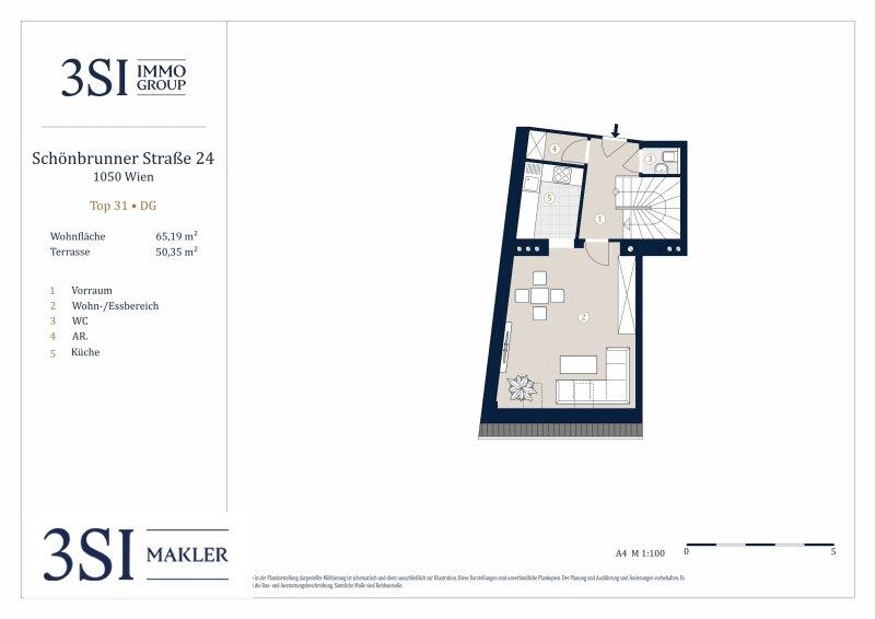 Die Wohnung ist zur Schönbrunner Straße hin in südöstlicher Richtung ausgerichtet, während die großzügige Terrasse in den ruhigen Innenhof nach Nordwesten zeigt.