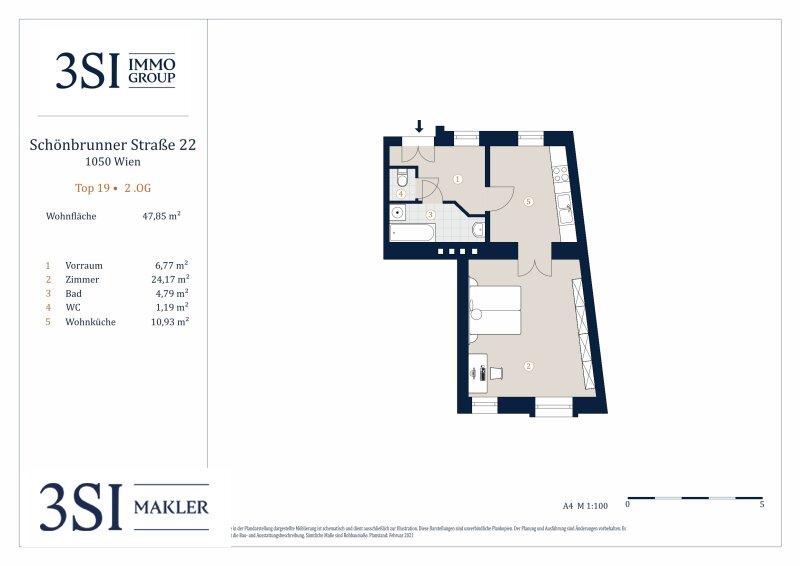 Zum Verkauf gelangt eine sanierte 2-Zimmer-Wohnung in einem gepflegten Stilaltbau in Top-Lage des 5. Bezirks. Sie überzeugt mit einem schönen Grundriss und ist sehr hell und sonnig! Sie verfügt über ca. 48m² Wohnfläche und teilt sich wie folgt auf:
