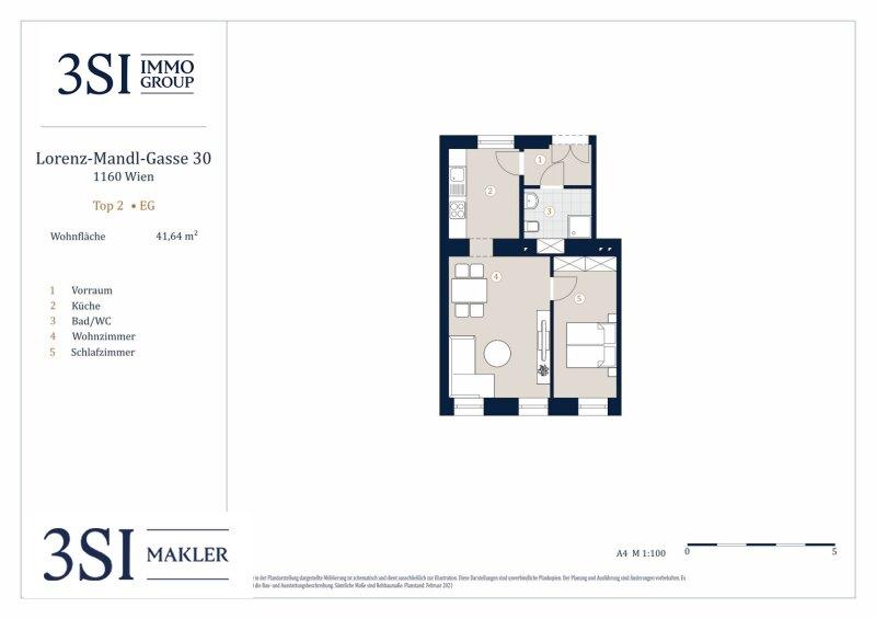 Die Wohnung bietet 41,64 m² und teilt sich wie folgt auf: