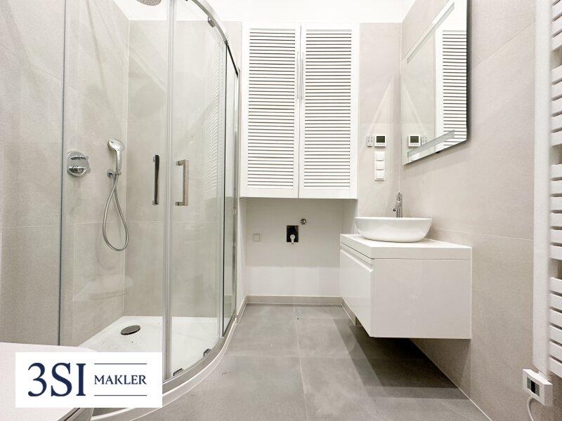 Vom Vorraum aus gelangen Sie in das Badezimmer mit Dusche, WC und modernen Designarmaturen, welche indirekt durch den Spiegel beleuchtet werden, wodurch eine spannende Lichtstimmung entsteht.