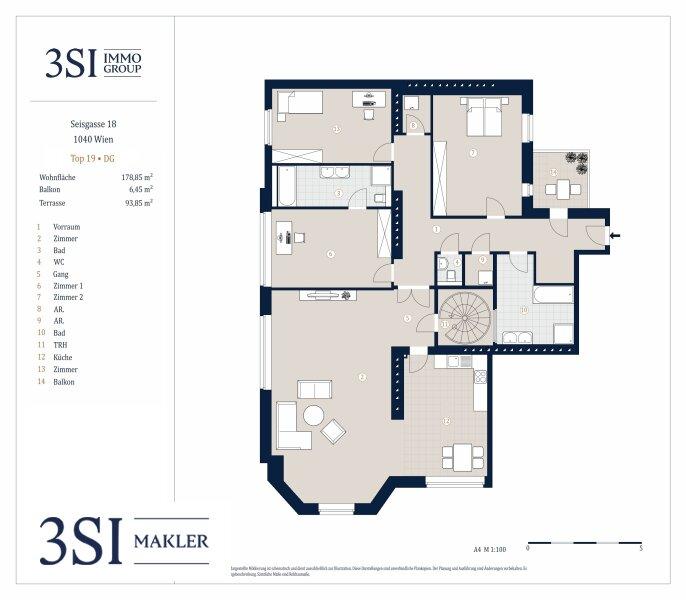 Diese exklusive 178 m² große Dachgeschoß-Wohnung vereint Luxus, Stil und modernen Komfort auf höchstem Niveau. Die Wohnung befindet sich in einem repräsentativen, gepflegten Stilaltbau in einer der besten Lagen Wiens. Die Wohnung ist in einem offenen, lichtdurchfluteten Stil gestaltet, die durchdachte Raumaufteilung und die luxuriöse Ausstattung bieten alles, was das Herz eines gehobenen Wohnanspruchs begehrt. Das geräumige Wohnzimmer bietet große Fensterfronten, von denen Sie einen atemberaubenden Blick über die Dächer der Stadt genießen. Vier weitere Zimmer bieten viel Raum für individuelle Nutzungsmöglichkeiten. Das Highlight ist die 94m2 große Dachterrasse, welche einen Panoramblick über Wien bietet. Zwei Marmorbäder, ein Vorraum und ein Abstellraum komplettieren dieses exklusive Stadtdomizil. Anspruch und Stil!