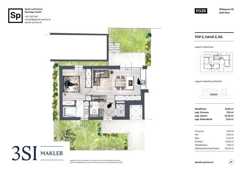 In idyllischer Umgebung an der Alten Donau in der Elidagasse 26 verführt diese Eigentumswohnung mit 52 m² Wohnfläche im Erdgeschoß, einem ca. 52 m² großen Eigengarten sowie einer ca. 7 m² großen Terrasse. Ausgestattet mit beeindruckender Qualität und erlesenem Geschmack teilt sich die Wohnung wie folgt auf: