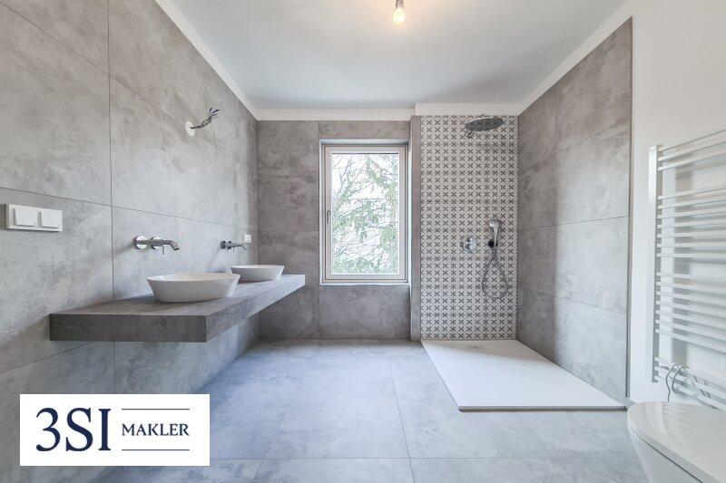 - Großformatige Feinsteinzeugfliesen in Bädern und WCs.