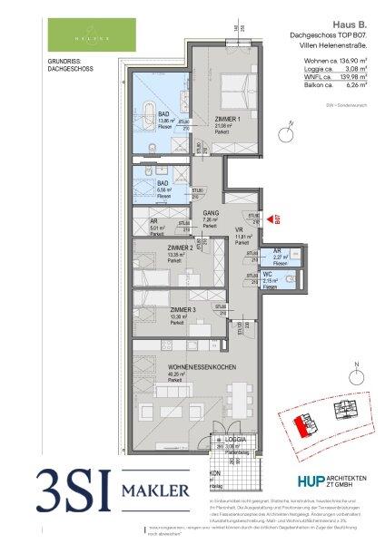 Diese moderne 4-Zimmer-Dachgeschoßwohnung verfügt über rund 136,90m² Wohnfläche zzgl. rund 3,08m² Loggiafläche, sowie rund 6,26m² Balkonfläche . Sie besticht durch ihren durchdachten Grundriss und teilt sich wie folgt auf:
