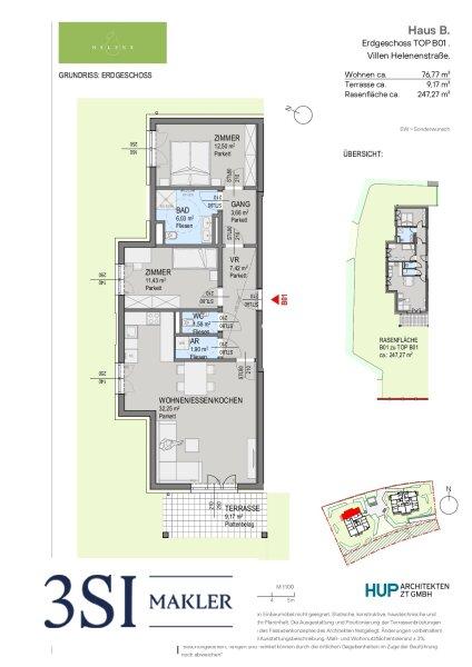 Diese moderne 3-Zimmer-Gartenwohnung verfügt über rund 76,77m² Wohnfläche zzgl. rund 9,17m² Terrassenflächen, sowie ca. 247,27m² Gartenfläche . Sie besticht durch ihren durchdachten Grundriss und teilt sich wie folgt auf: