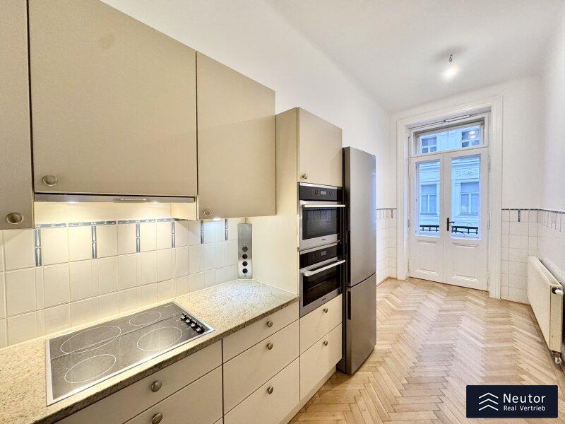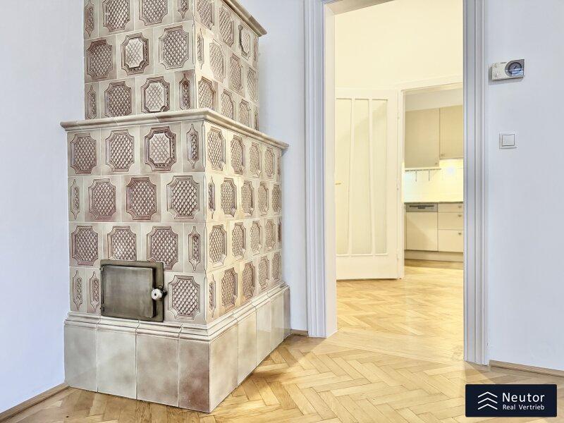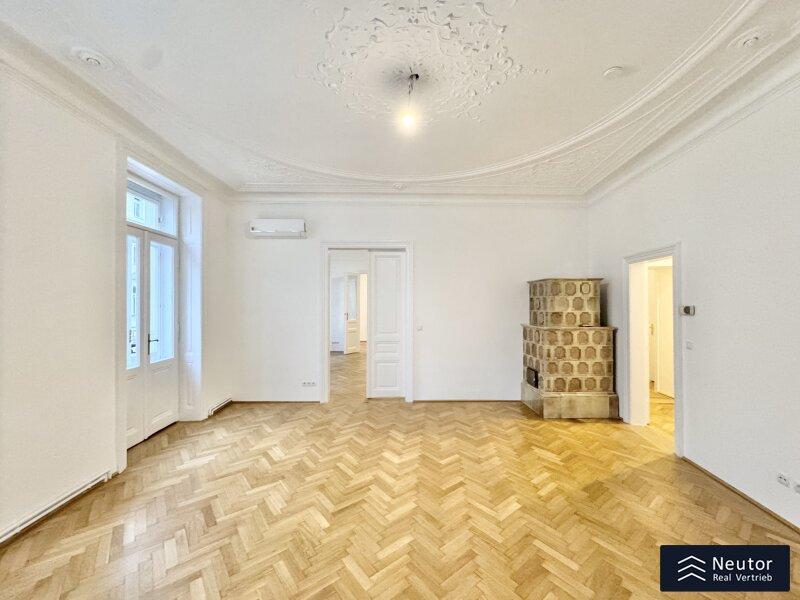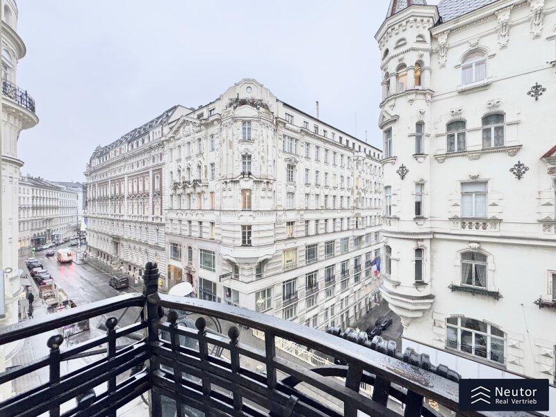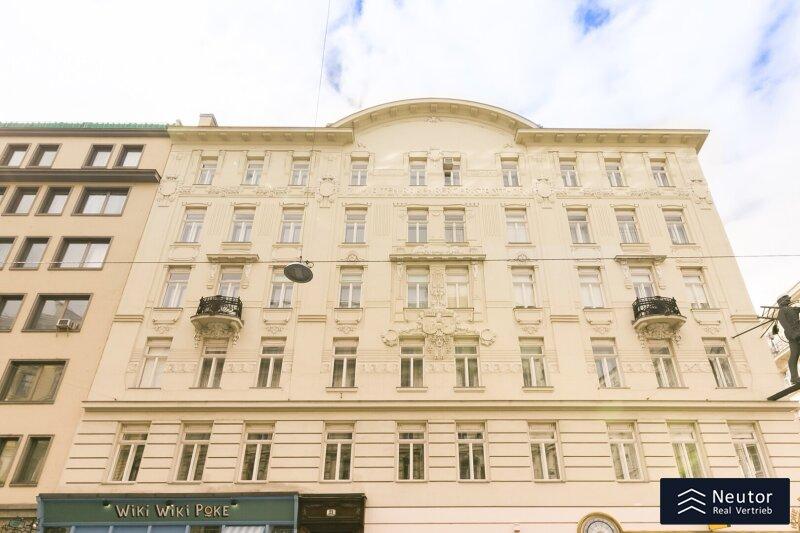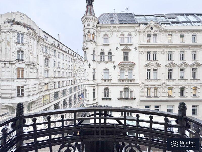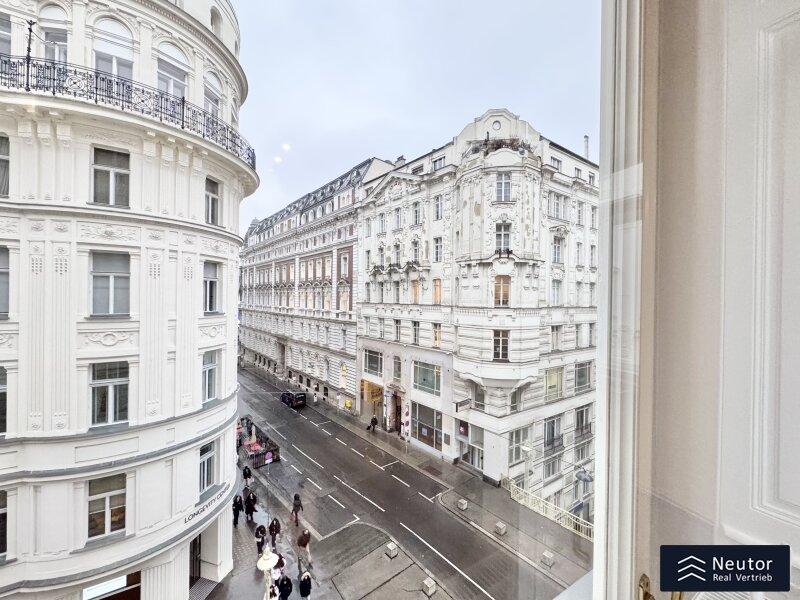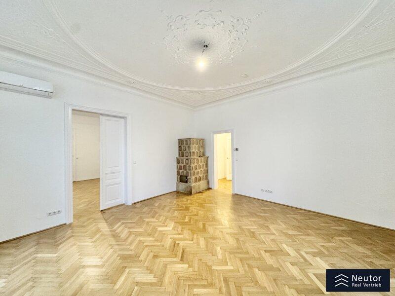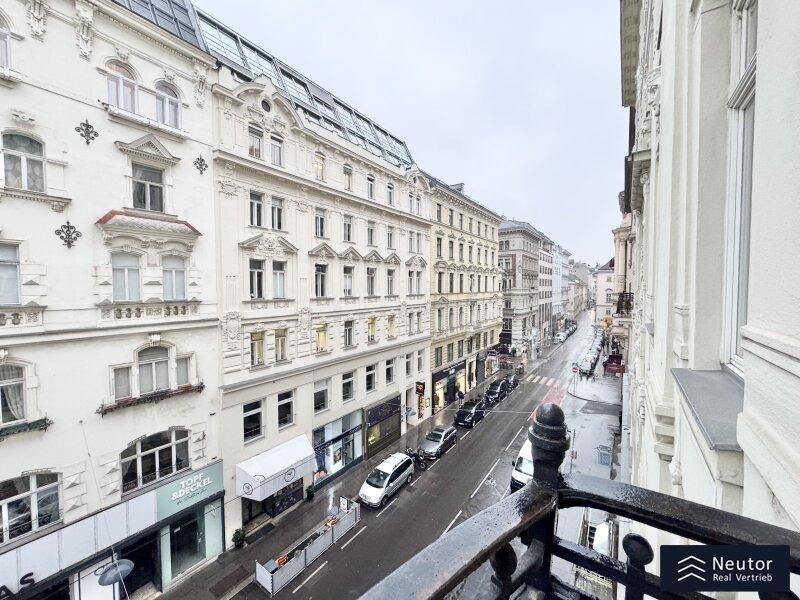 Das Staunen beginnt bei diesem Stilaltbau bereits vor der reich gegliederten Fassade und dem repräsentativen Eingangsbereich, welcher sich im wunderschönen Originalzustand präsentiert. Bequem gelangen Sie per Lift in das 2. Regelgeschoss, von welchem aus Sie nur mehr wenige Schritte von der großzügigen 4-Zimmerwohnung trennen. Die Wohnung wurdevor wenigen Jahren aufwendig teilsaniert und revitalisiert und besticht durch edlen Fischgrätparkett, welcher nahtlos durch die Räume verlegt ist, Kassettentüren, hohe Räume, alles Stilelemente was einen schönen Altbau ausmachen. Sie betreten Ihre neue Wohnung über einen großzügigen Vorraum, welcher ausreichend Platz für eine Garderobe bietet. Von diesem aus gelangen Sie in das Kabinett und zur Küche. Ebenso erreichen Sie das separate WC sowie dem kompakten Badezimmer mit Dusche. Die Einbauküche wurde separat angelegt und lädt förmlich zum Kochen ein. Diese wurde mit Marken-Geräten ausgestattet und kann ebenso mit einem kleinen Balkon punkten - beeindruckenden Ausblick auf den tiefen Graben und die Wipplingerstraße inklusive. Kreisförmig angelegt, erreichen Sie weiteren Räume dieser 4 Zimmerwohnung. Blickfang garantiert im Eck-Wohnzimmer der große formschöne Kachelofen, der in den Wintermonaten eine wohlig warme Wärme in diesen Wohntraum zaubert. Im Sommer hilft Ihnen die installierte Klimaanlage im Wohnzimmer einen kühlen Kopf zu bewahren. Eine tolle Wohnung in bestens angebundener Lage!